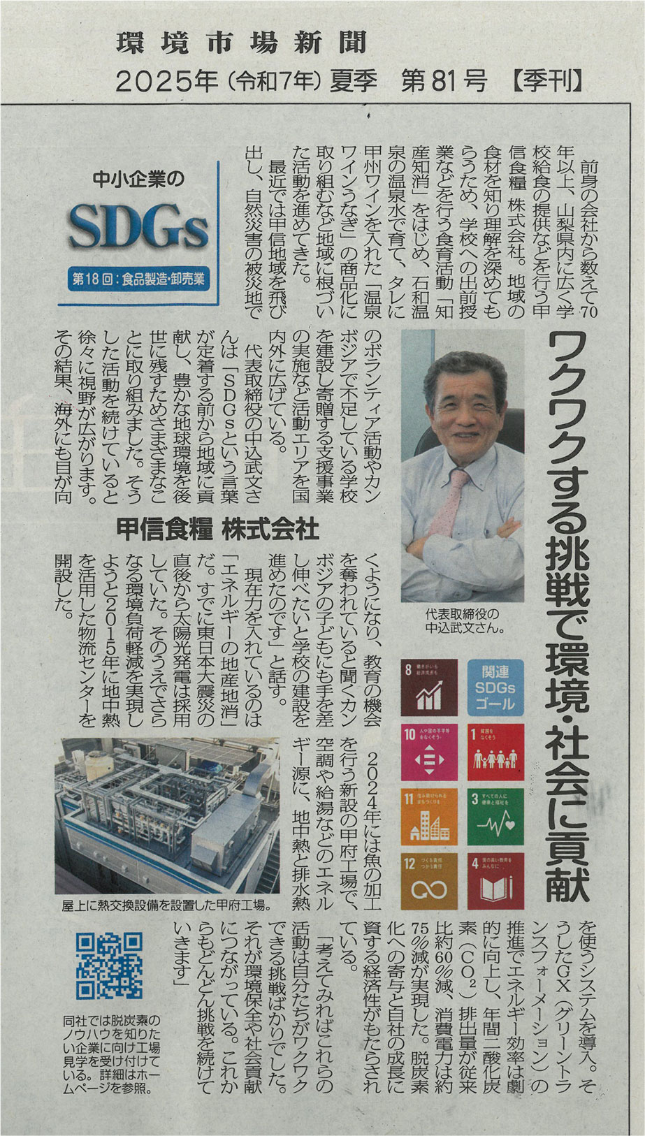 このたび、『環境市場新聞(2025年夏季・第81号)』において、甲信食糧株式会社のSDGsへの取り組みが紹介されました。